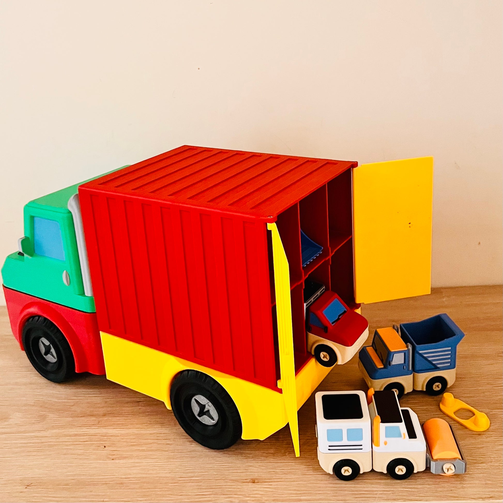 Holds 12x 2 peice trucks or 6x 4 piece trucks. Back doors open and close and have a cute little locking part. Wheels all turn so your little one can drive their fleet of vehicles to bed at night for a tidy end to a big day of play and adventure.